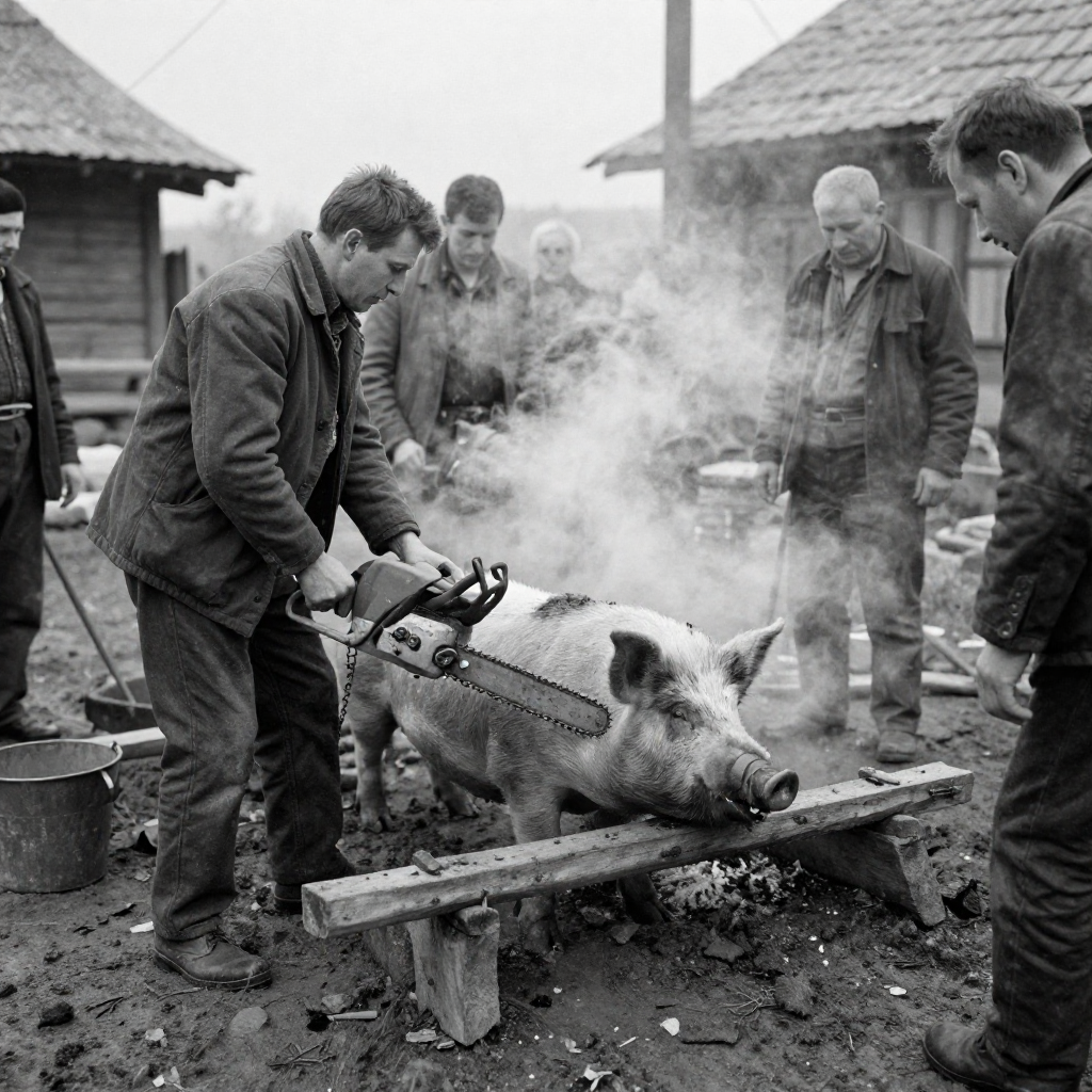A disznóvágás napja általában korán kezdődött, amikor a résztvevők csendben összegyűltek az udvaron. Az áldomás elfogyasztása nemcsak hagyomány volt, hanem a munkafolyamat elengedhetetlen része, mivel úgy tartották, hogy a megfelelő mennyiségű pálinka biztosítja a láncfűrész egyenletes működését és a résztvevők döntéseinek helyességét. A tényleges munka megkezdése előtt hosszabb ideig szemlélték az eszközöket, különösen a fémházas láncfűrészt, amelyet sok helyen a hagyományos késsel egyenértékűnek tekintettek.